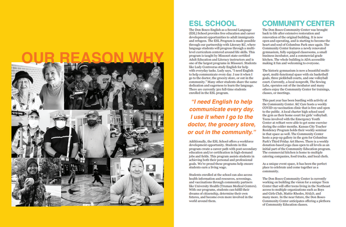 This role allowed me to support work that truly mattered by helping provide nutrition, education, and a sense of belonging to the Kansas City community. I began at The Don Bosco Centers in a volunteer position through the AmeriCorps VISTA program. After my year of service, they hired me as their full-time Director of Marketing and Communications. During my time there I brought consistency and heart to every aspect of my job, from event branding and social media to printed appeals and strategic communications. While it eventually became time for me to move on, the experience left a lasting impact on me, and I’m proud of the creative foundation I helped build during my time there.